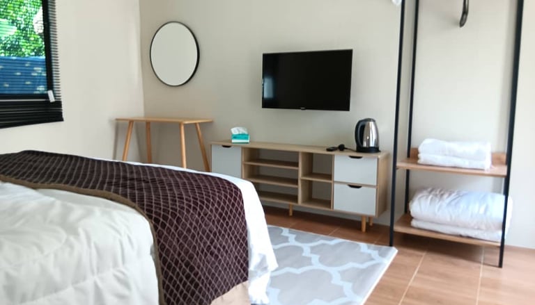 Simple and comfortable room beside pool, perfect for a cozy stay with essential amenities and a relaxing atmosphere.